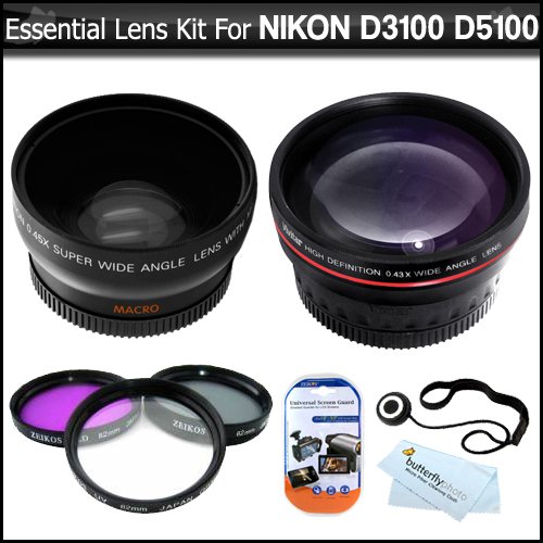 Essential Lens Kit For Nikon D3100 D5100 Digital SLR Camera Which Have Any Of These (18-55mm, 55-200mm, 50mm) Nikon Lenses Includes HD Wide Angle lens w/ Macro + HD 2X Telephoto Lens + Multi-Coated 3pc Filter Kit (UV-CPL-FLD) + Lens Cap Keeper + More