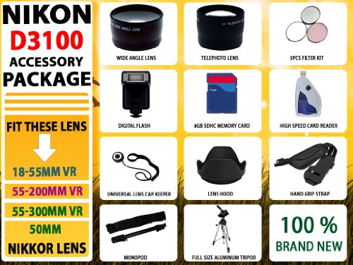 Nikon D3100 SLR Digital Cameras Accessory Package Including Wide Angle Lens, Telephoto Lens, Filter Kit, 8GB SDHC MEMORY CARD, Digital Flash, Monopod, Tripod & MUCH MORE!!